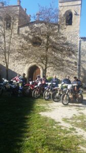 A la sortida de missa es torna a omplir la plaça. Els motards amb les seves motos es fan les fotos amb els companys. Imatges en posició, motoristes de peu damunt les motos, marxant cap a la Llacuna fent piruetes de trial…
