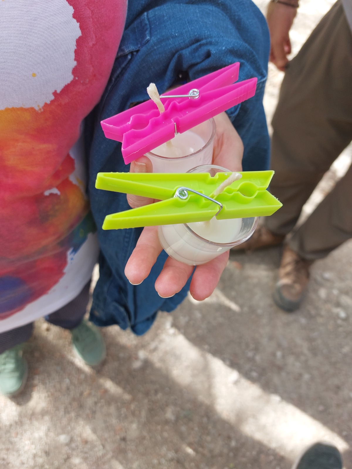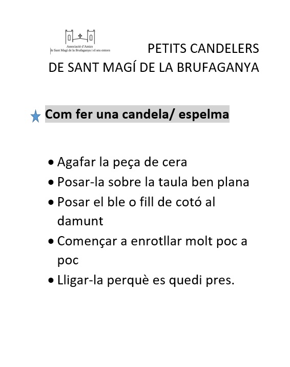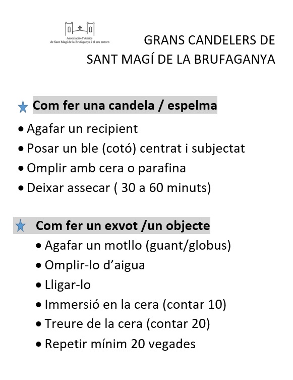 Els petits dauradors i candelers de Sant Magí fan una espelma, dibuixen una postal amb daurats. Mentre, els grans dauradors i candelers de Sant Magí , experimenten diferents textures des de la cera metal·litzada daurada, la mixtió, la inserció del pa d’or i treballen creant una espelma dins un recipient. La cuina a l’aire lliure manté el grup de grans candelers fent, per immersió, un exvot ( l’escultura d’una ma de cera).