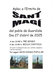 Aplec a Sant Magí de Guardiola Tradicions religiosesNotícies Última actualització abr. 22, 2025 El diumenge dia 27 d’abril, se celebra l’Aplec a l’ermita de Sant Magí, al poble de Guardiola . Tots hi sou convidats. Us animeu? Compartir FacebookTwitterEmail