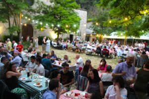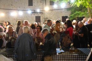 Només arribar veiem la plaça del Santuari plena de taules amb gent sopant. Voluntaris han preparat els entrepans i begudes que se serveixen. Les taules es comparteixen entre amics, coneguts i també noves amistats, ningú se sent estrany. D’on veniu? És el primer any? O també: com esteu? I la família? Converses planeres en el caient de la tarda tot esperant que la campana avisi que comença el concert.