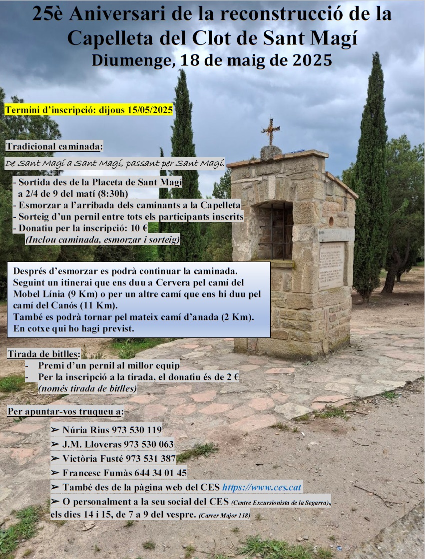 Diumenge 18 de maig, a la Capelleta de Sant Magí a Cervera, estem d’enhorabona. Celebrem el 25è aniversari de la seva reconstrucció. Ho farem amb una caminada que, des de la placeta de Sant Magí, arribarà fins la capelleta de Sant Magí (2 Km)